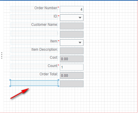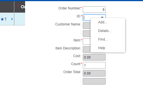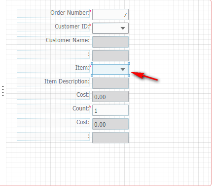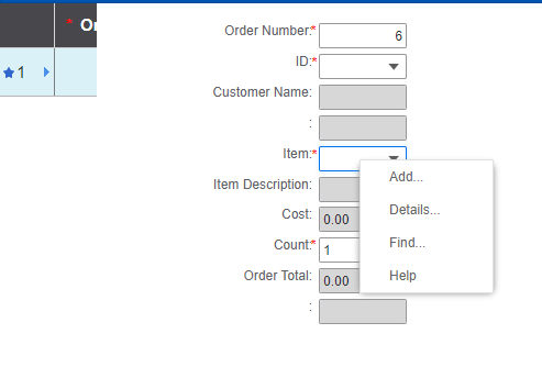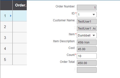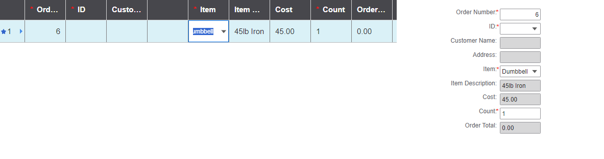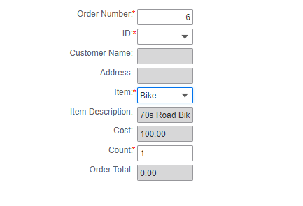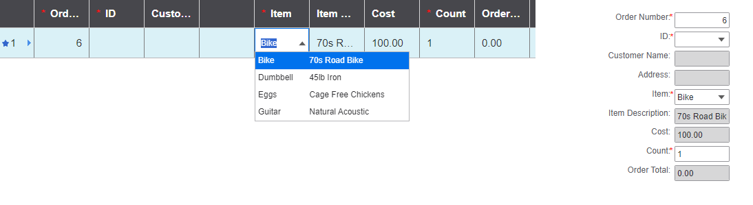 Switch to back to the Runtime Mode tab and reopen the Orders form. Change the item on the form or in the grid to see the component class now populating the item Description and Cost immediately.