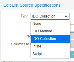 On the Edit List Source Specifications modal, set the Type field to IDO Collection from the drop down list.