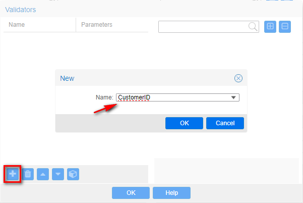 On the Validators modal, click the + button to add a validator to our component class. On the New modal, select our CustomerID validator and click Ok.