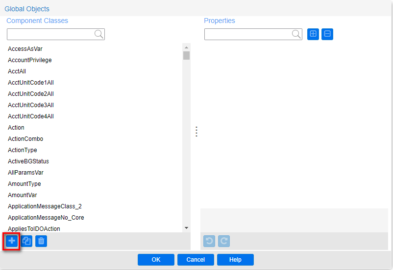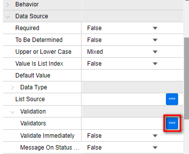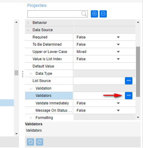 Within the Global Objects modal, in the Properties panel, expand the Data Source section. Expand the Validation section and click the Validators ellipsis.