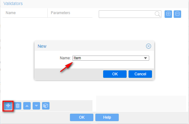 On the Validators modal, Click the + button and for the Name field, select the Item validator.