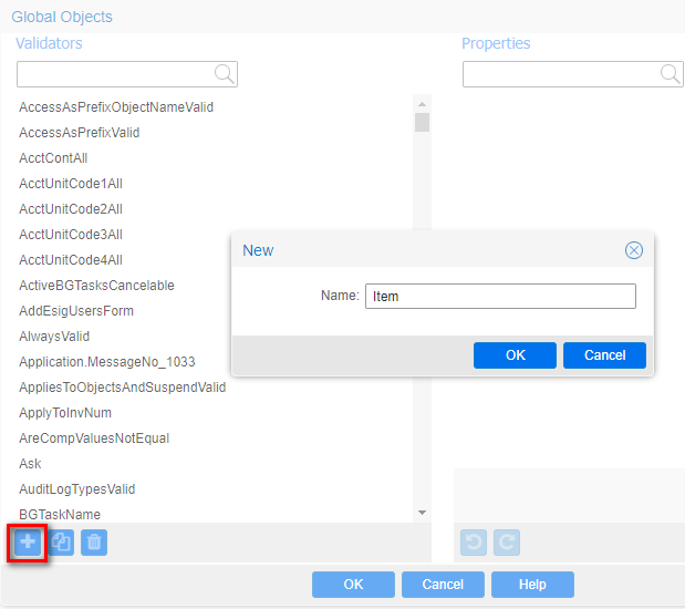 Switch back to the Web Designer and click on the Edit > Validator menu item. On the Global Objects window, click the + button at the bottom. Set the Name field to Item and click Ok.
