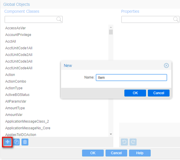 Click on the Edit > Component Class menu item. On the Global Objects modal, click the + button on the bottom left. Set the Name field to Item, and then click Ok.