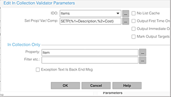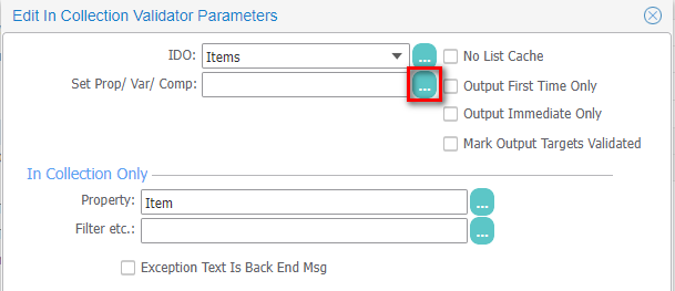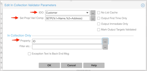 When the Edit In Collection Validator Parameters modal opens, set the IDO field to Customer and in the Collection Only sections. Use the ellipses to set the Property value to ID.