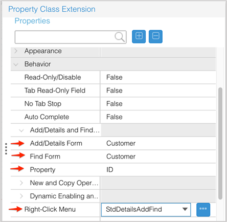 After the Property Class Extension modal opens, expand the Behavior section, and then expand the Add/Details and Find Form section. Set the Add/Details and Find Form fields to Customer. Set the Property field to ID.