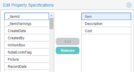 On the Edit Property Specifications modal, use the Add button to add the Item, Description and Cost properties. Then click Ok.