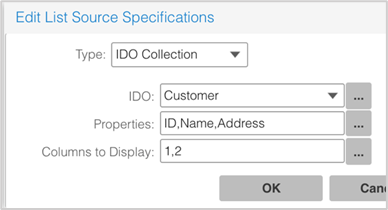 On the Edit List Source Specifications modal, from the drop down set the Type field to IDO Collection. For the IDO field, select Items and then click the Properties ellipsis.