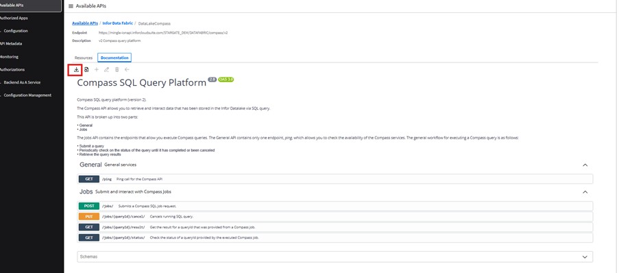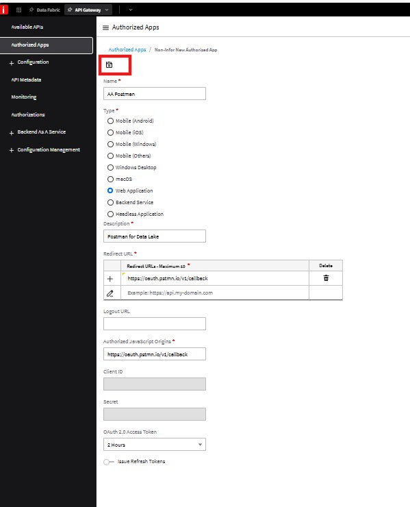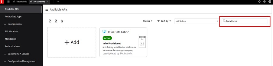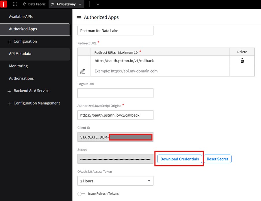 External applications need to be authorized to connect to Datalake. For that we use IONAPI Gateway to create credentials to be used as a token of authorization.