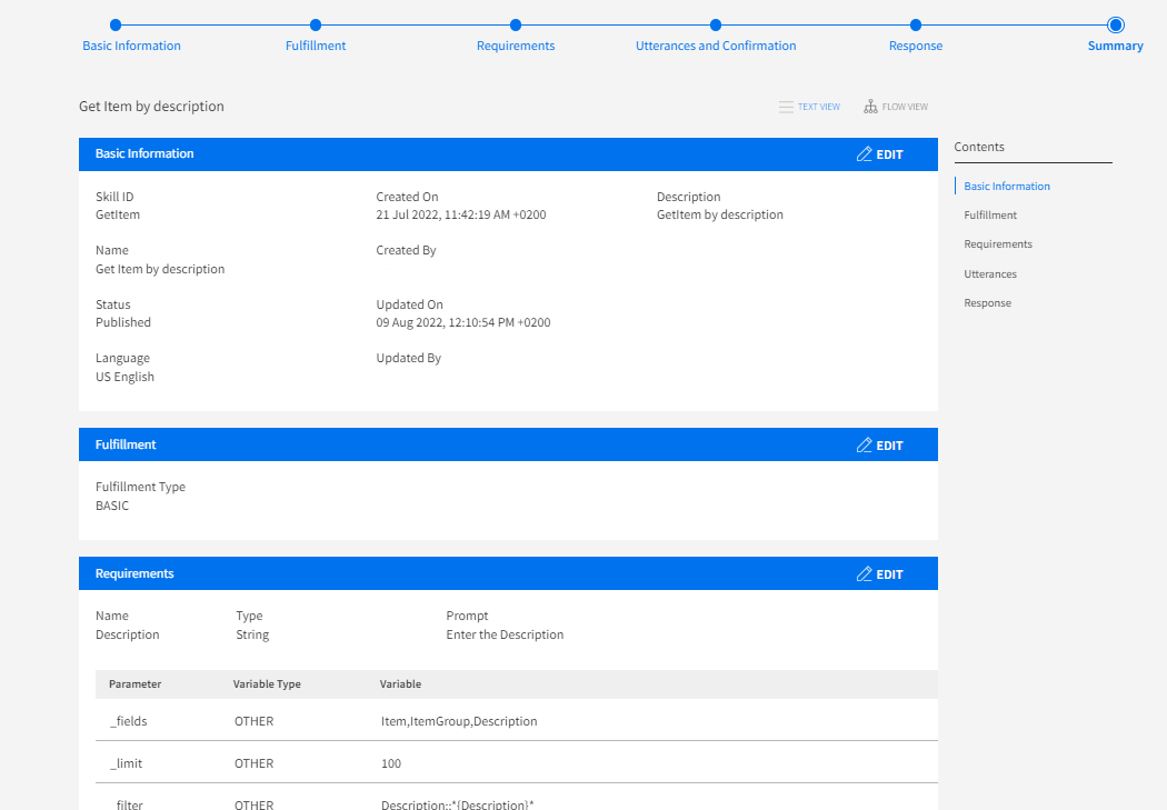 - Click Next. Review the skill on the summary page in the text view or flow view.