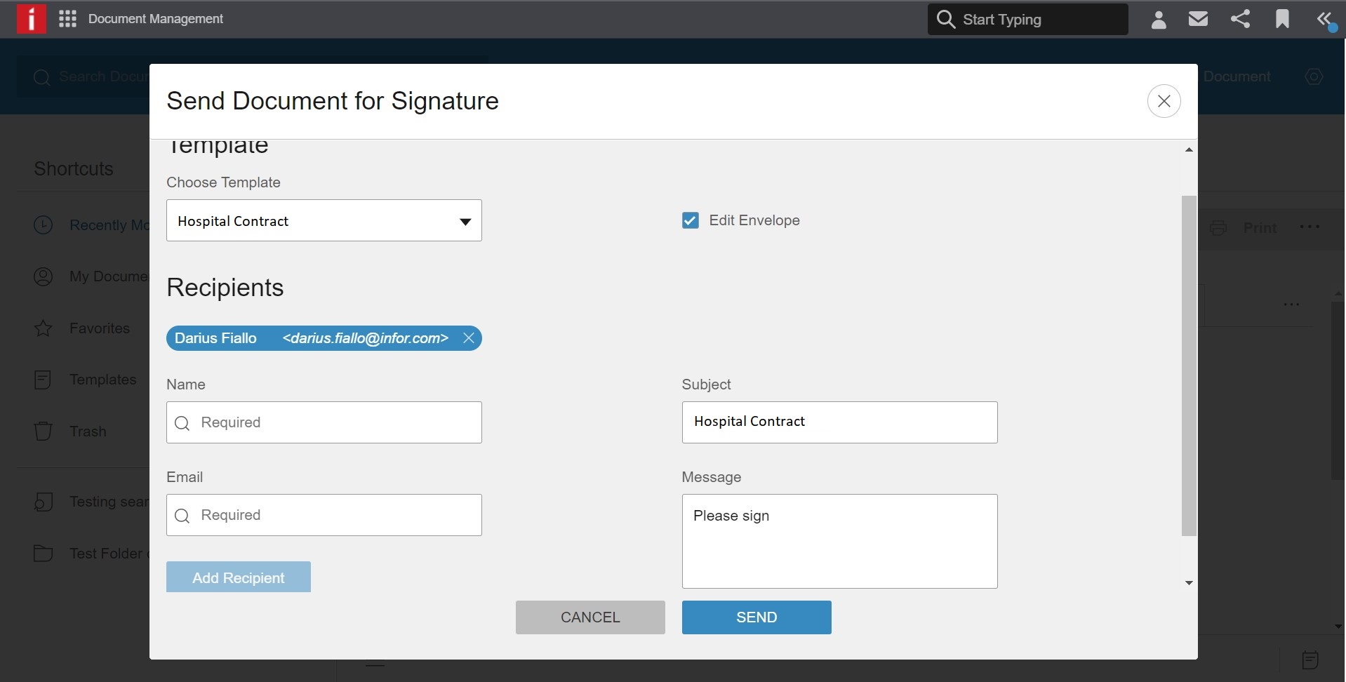 Infor Document Management allows you to use DocuSign templates connected to your DocuSign account and combine it with documents sent from IDM.