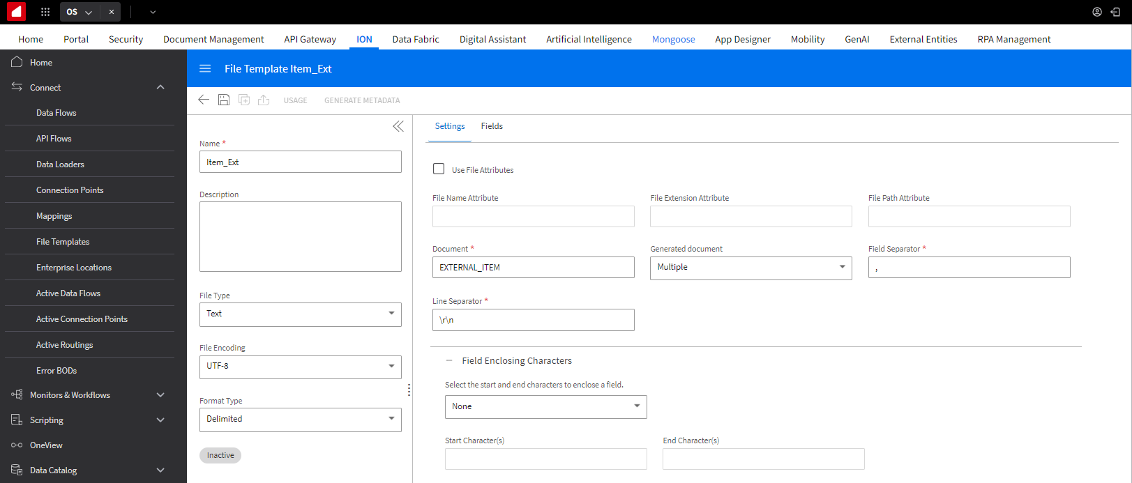 In the configuration section, you’ll need to specify a Name for the file template and have the option to include a Description . You also need to define the File Type (text or binary), File Encoding (such as UTF-8 or ISO8859-1), and the Format Type (Delimited, Fixed-Length, Fixed-Length & Delimited, Full BOD, or XML).