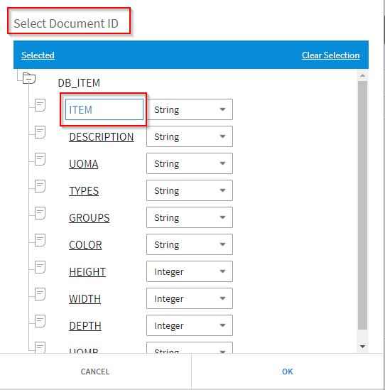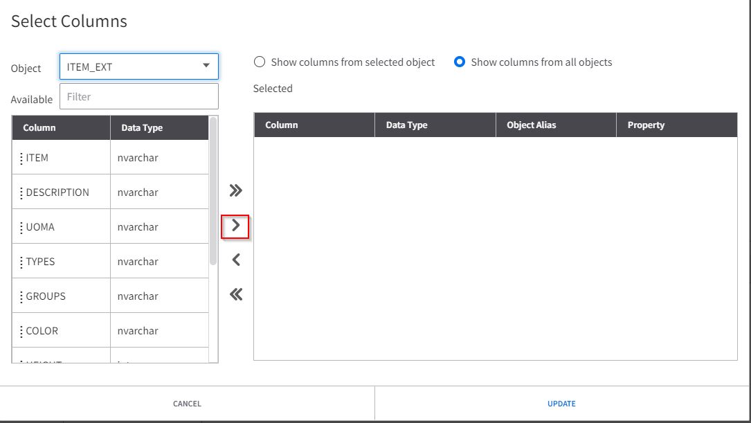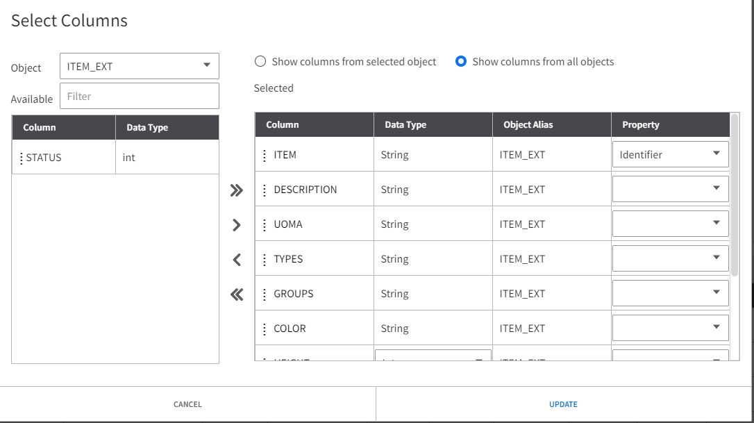 Select the columns you are interested in and click the > arrow. In the ITEM row, use the dropdown list of the Property column and select identifier , then click the UPDATE button.