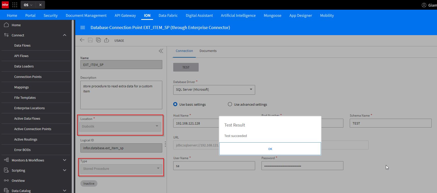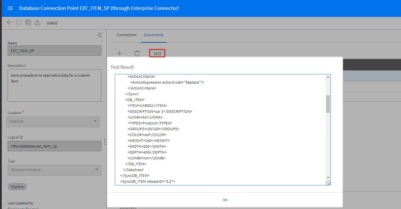 ('CAR003', 'car 3', 'EA', 'Product', 'USF100', 'white', 400, 400, 400, 'mm');GOTransfer back to the OS Portal, and from the connection point you just creating click the TEST button. You will receive XML output with the BOD structure.
