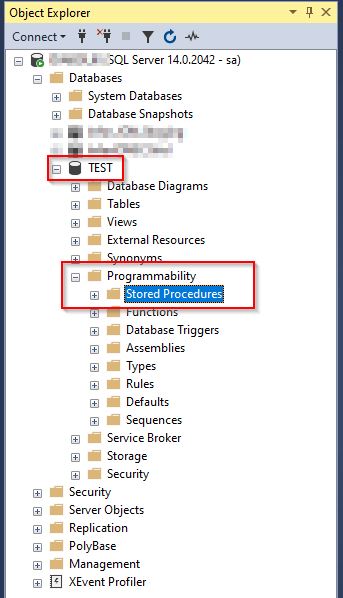 Let's now move to the SQL server and create the stored procedure. With SQL Management Studio , connect to the database we have specified in the connection tab and expand the database ( In this example it is named TEST ), expand Programmability , and select Stored Procedures .