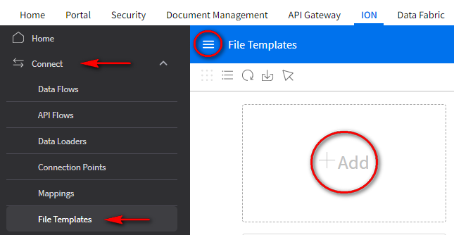 Click the Menu icon then expand the Connect option, click the File Templates item, and click the ( + ) Add option.