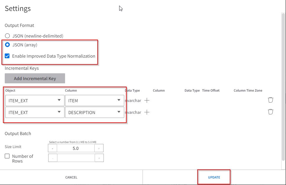 Click the Settings icon as described above and in the settings form, select output format as JSON (array) , flag the Enablement Improved Data Type Normalization option, click twice on the Add Incremental Key button to add two rows. Configure the Object and Column fields as below, then click UPDATE .