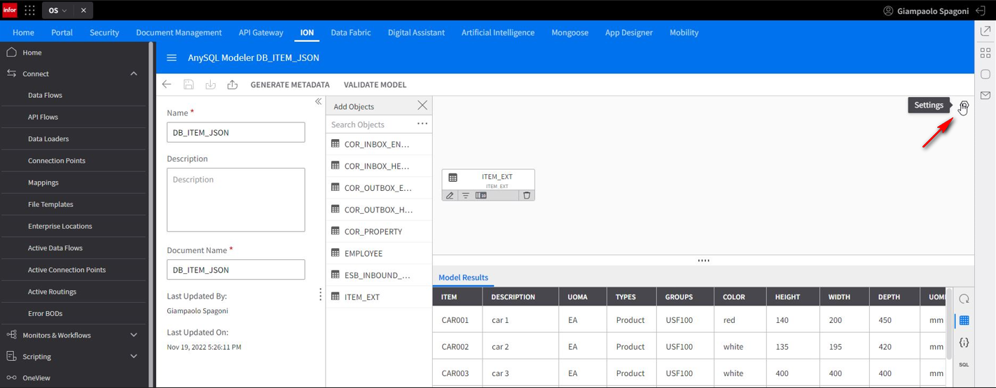Click Save on the connection point and click the GENERATE METADATA button to create the JSON Object Schema, you will get a message that the schema has been generated successfully